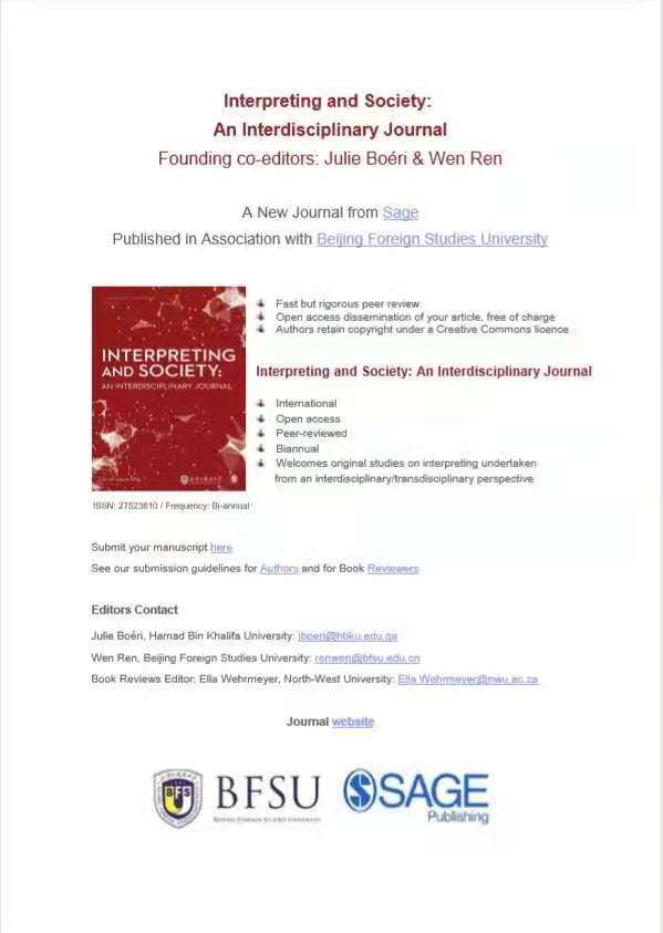 英文国际期刊Interpreting and Society: An Interdisciplinary Journal 正式创刊! 日前,由Beat365正版唯一官网必一与Sage出版社联合推出的Interpreting and Society: An Interdisciplinary Journal 在各方共同努力下正式创刊。Interpreting and Society: An Interdisciplinary Journal是中国第一本口译研究期刊,同时也是由中国高校发起的第一本英文国际口译期刊。Dr. Julie Boeri和高翻学院院长任文教授共同担任期刊主编,期刊顾问...