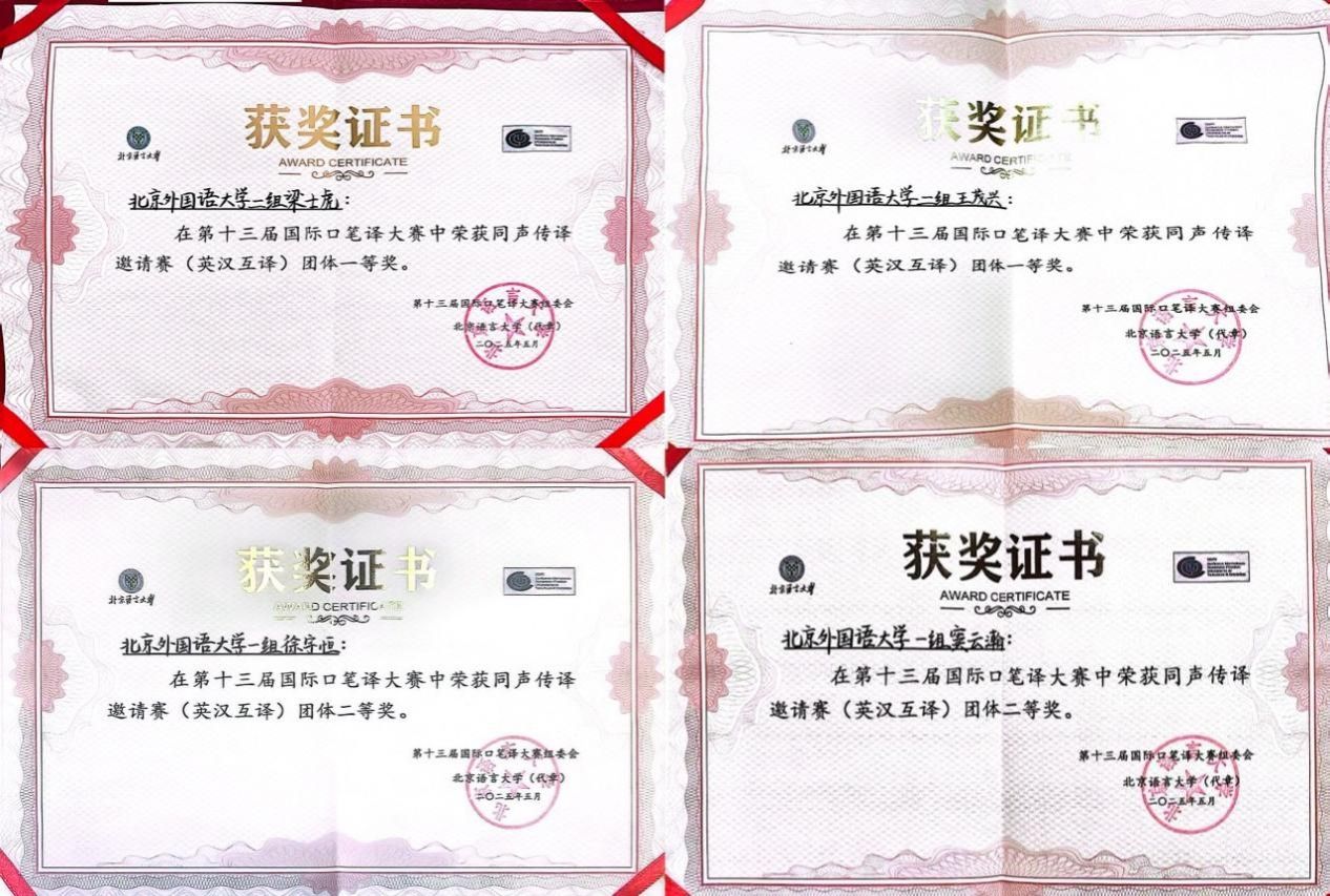 2025年5月24日,第十三届国际口笔译大赛同声传译邀请赛(英汉互译)决赛圆满完赛。Beat365官网四名学生包揽团体冠亚军、个人冠季军,荣获一、二、三等奖。梁士虎(右)和王茂兴(左)同学荣获团体一等奖(冠军)徐宇恒(右一)和窦云瀚(右二)同学荣获团体二等奖(亚军)大赛由国际大学翻译学院联合会(CIUTI)、国际会议口译员协会(AIIC)和中国翻译协会(TAC)口译专业委员会支持,北京语言大学主办。本届大赛的主题为“人工智能与世界”...