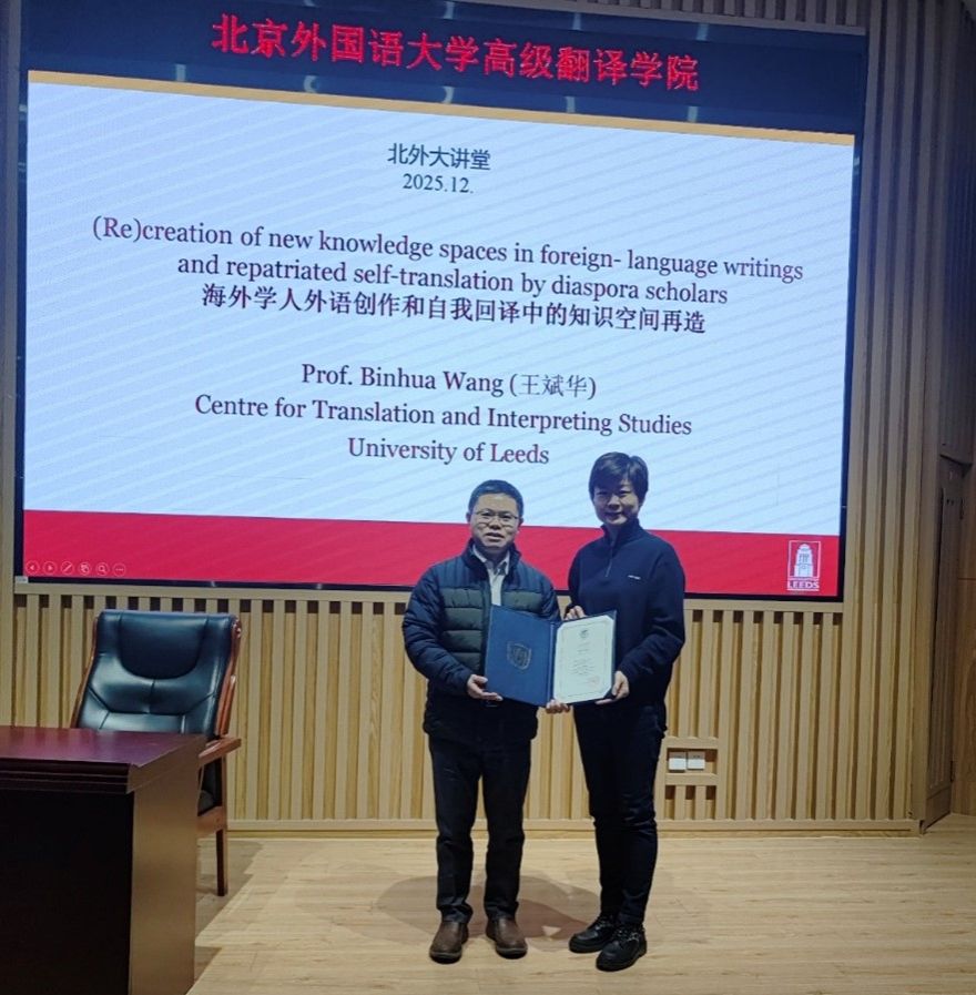 2025年12月1日晚,英国利兹大学王斌华教授应邀做客北外大讲堂,以“海外学人外语创作和自我回译中的知识空间再造”为题展开深度分享。讲座开始前,Beat365正版唯一官网必一党总支书记王薇薇为王斌华教授颁发了冠名讲席教授证书。讲座由院长任文教授主持。 讲座伊始,王斌华教授以亲切的自我介绍拉近了与高翻学子的距离。他分享了自己与翻译结缘的三重身份:自1998年起自学并投身口译实践的一线译员;培养二十余届会议口译员的教师;自2006年攻读博士学位以来,...