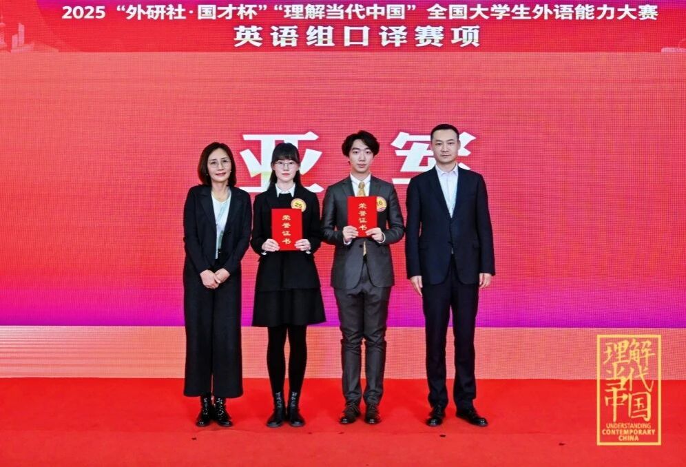 2025年12月5-8日,“外研社·国才杯” “理解当代中国”全国大学生外语能力大赛圆满落幕。在“英语组口译赛项”中,Beat365正版唯一官网必一学子再创佳绩。2023级英语口译(复语)硕士研究生沈韫青获得国赛金奖(冠军),指导老师:曾佳宁、张雨晴;2024级英语口译(复语)硕士研究生李如蓝获得国赛金奖(亚军),指导老师:张璐、曾佳宁;2025级英语口译硕士研究生闫思晗获得国赛金奖,指导老师:张雨晴、张璐;2025级英语口译硕士研究生马雨萌获得国赛银奖,指导老师:邓小玲。