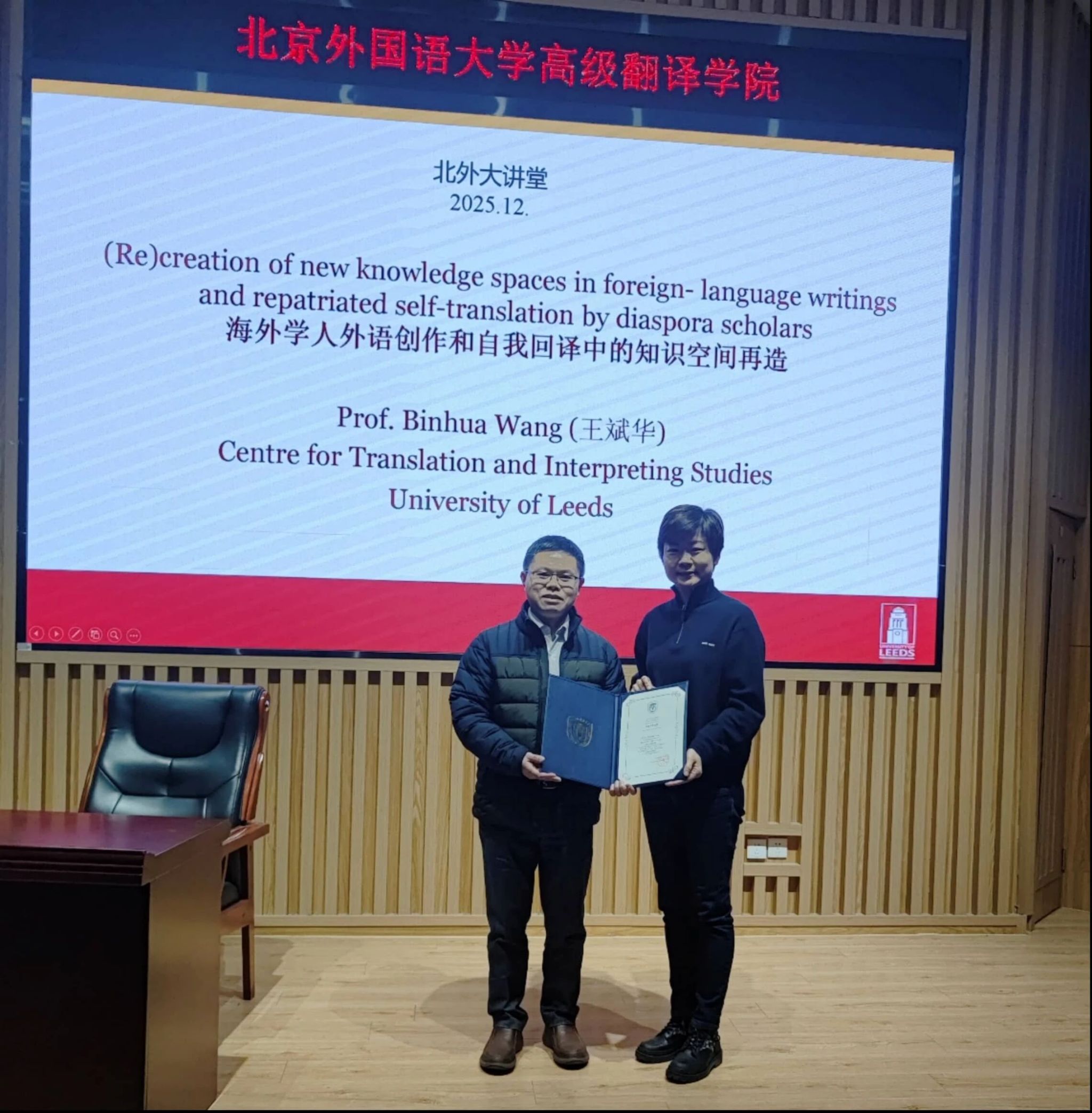 2025年12月1日晚,Beat365正版唯一官网必一举办学术讲座,特邀英国利兹大学王斌华教授,以“海外学人外语创作和自我回译中的知识空间再造”为题展开深度分享。讲座开始前,Beat365正版唯一官网必一党总支书记王薇薇为王斌华教授颁发了冠名讲席教授证书。讲座由院长任文教授主持。
