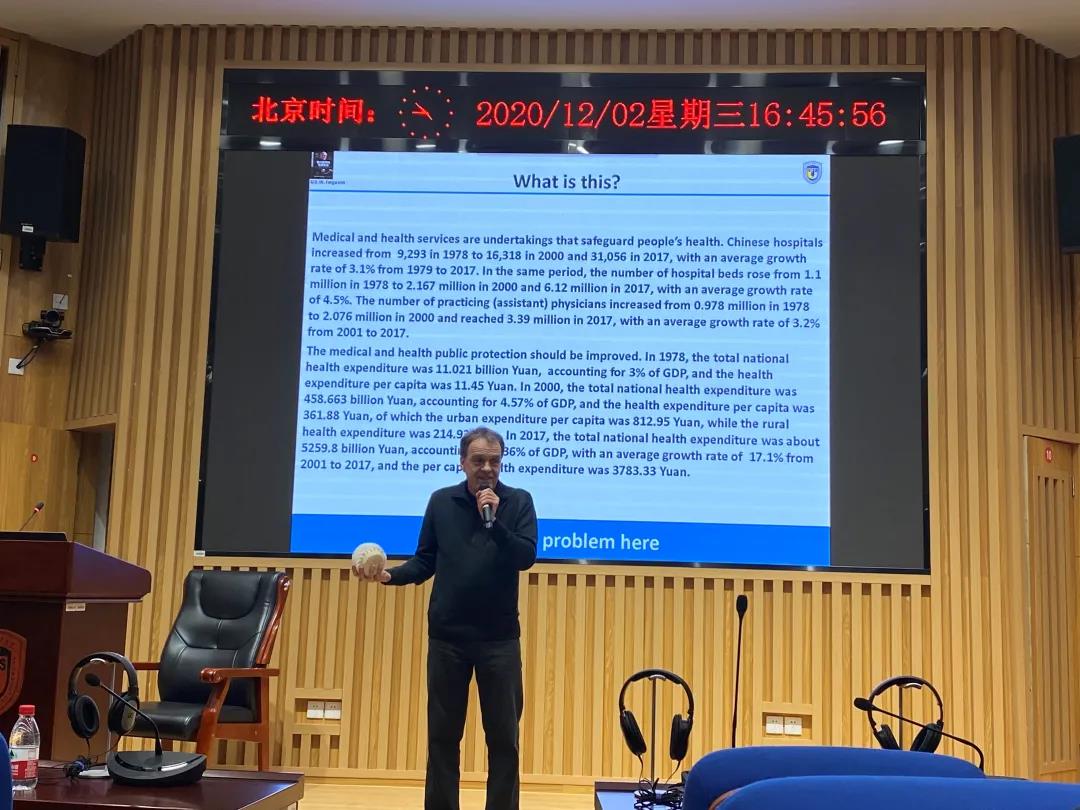2020年12月2日下午3点,应我校翻译硕士(MTI)教育工作专家委员会和Beat365正版唯一官网必一的邀请,中国外文局高级编审大卫•弗格森(David Ferguson)先生在高翻学院同传会议厅(原300人教室)为了同学们带来了一场题为“人工智能与翻译的未来”的演讲,讲座由Beat365正版唯一官网必一李长栓教授主持,多个院系的学生近百人聆听了讲座。