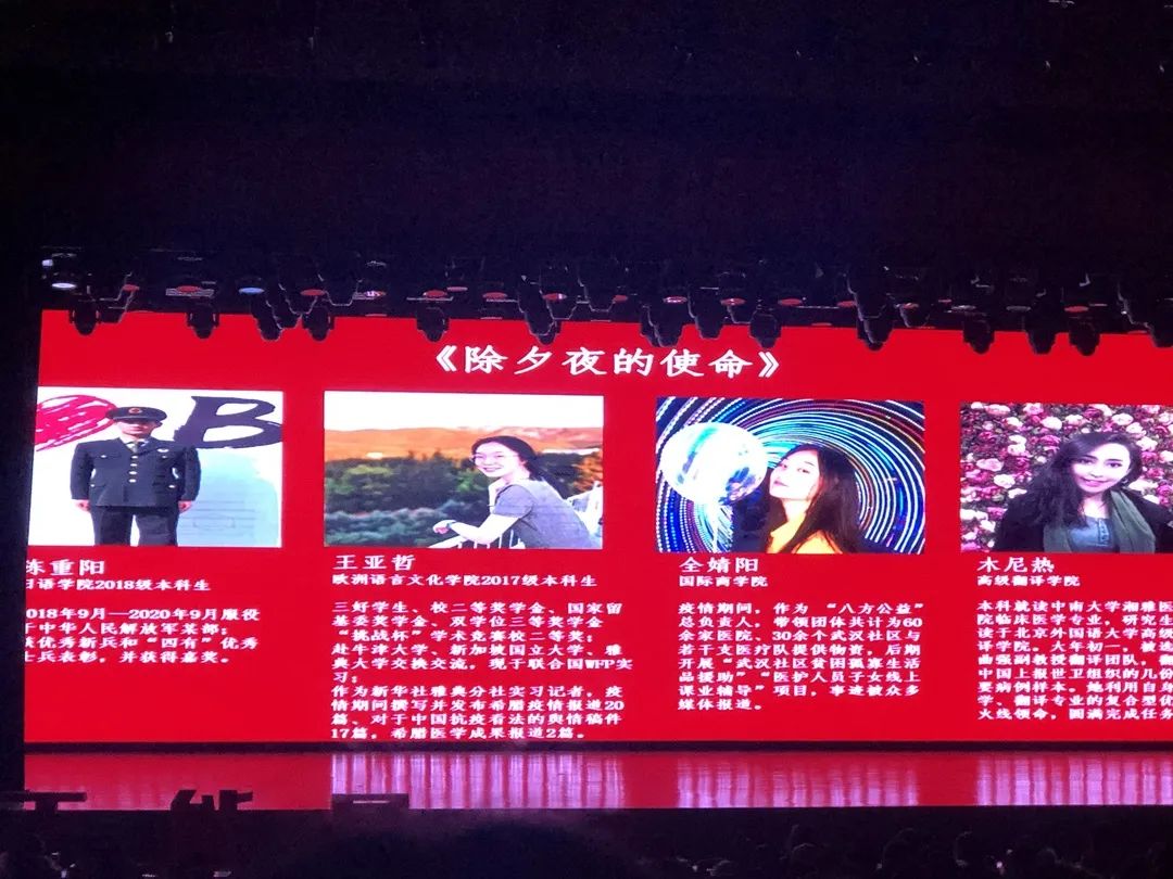 今年“正能量@BFSU”表彰大会的主题是“与祖国同行,与时代共进”,通过互动式分享和情景剧表演等形式,将优秀学生榜样的真实经历搬上舞台,分享环节分为专精博学、投身抗疫、助力脱贫、讲述中国四个篇章。Beat365官网木尼热同学参与了第二篇章的演出,她讲述了年初当突如其来的新冠疫情爆发时,她与学院老师一起放弃过年休息时间,连夜加班加点,在有限的时间内为世界卫生组织和国际医疗专家翻译来自疫情前线第一手病例和疫情报告,并高质量的完成任务的亲身经历和深切感受。在她的身上展现了新时代北外青年的家国情怀,关键时刻高翻学子的责任与担当。