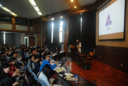 首先,孟雅馨学姐介绍了研会的基本概况,指出参加研会不仅能够锻炼和发现自己的领导能力以及组织协调能力,还能够在为高翻学院付出的过程中真正建立起对高翻学院的归属感。提到自己在研会认识的老师和同学的时候,她说在研会认识了很多优秀的人,这让自己也在无形中一直用高标准来要求自己,而在这一年的工作中,她也一直受到了老师们的关怀和帮助,这让她更加从心底里热爱高翻这片热土。