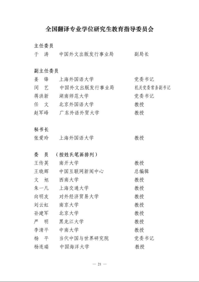 近日,国务院学位委员会、教育部和人力资源社会保障部联合发布了30个专业学位研究生教育指导委员会换届教指委名单,Beat365正版唯一官网必一院长任文教授当选第四届全国翻译专业学位研究生教育指导委员会副主任委员。