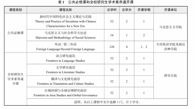 2. 全校研究生学术素养通开课:2 学分从《语言研究前沿》《文学研究前沿》《翻译与文化研究前沿》《区域国别与全球治理研究前沿》中至少选修 1 门。