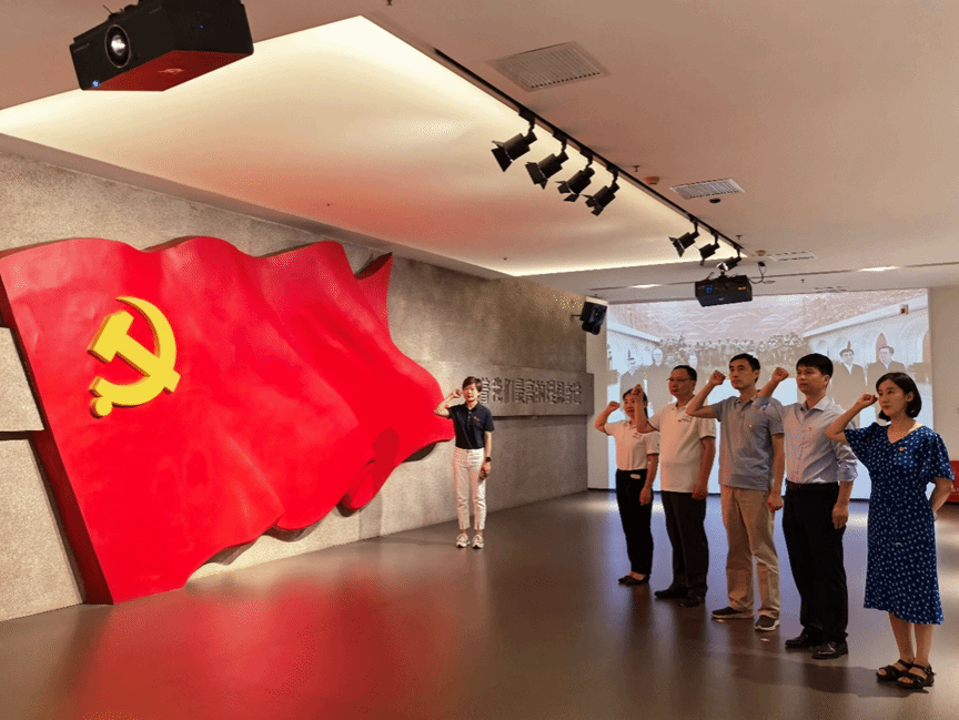 参观学习结束前,党总支理论学习中心组全体党员重温入党誓词。在庄严的党旗下,党员们举起右拳,郑重宣誓。每一句誓词都铿锵有力,回荡在展厅中央。这一刻,不仅是对入党初心的重温,更是对党员使命的再次铭记。