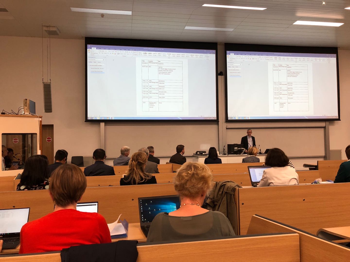 大会由CIUTI主席,来自意大利Trieste大学的Maurizio Viezzi教授主持。29日上午,大会听取了上一年度工作报告和预算,审议了下一年度工作计划和预算,正式批准了新成员Poznan大学翻译学院的加入。下午,大会讨论了CIUTI网站建设、博士生资助计划、论坛下一届议程等问题。在会员单位项目展示中,我校任文教授做了“译员培养中的国际合作”主题发言,对我校高级翻译人才培养及国际合作模式做了精彩展示,起到了很好的宣传效果。在机构发言环节中,欧盟口译总司司长Florika Fink-Hooijer、欧洲议会笔译总司多语种外联处处长Alison Graves、欧洲法律翻译协会(EULITA)主席Daniela Amodeo等作了发言。