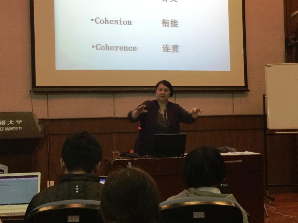 施老师首先从宏观层面上介绍了语言的四个分析角度,即搭配、含义、衔接、连贯(4S),并和同学们探讨了语篇的功能、分类和语言的结构。在此基础上,施老师从微观层面深入分析了两种语言在上述各方面的差异,对语音系统、书写系统、语义和语法结构等方面进行了辨析。从两种语言的差别着眼,施老师简要回顾了主要的翻译技巧,包括解包袱法、词性转换、增减重复法、反面着笔法等。在最后的总结中,施老师颇具新意地将英语比喻成“火车”,将中文喻为“风扇”,生动形象地体现了两种语言在语言组织和语法结构上的重要差别,给同学们留下了深刻的印象。